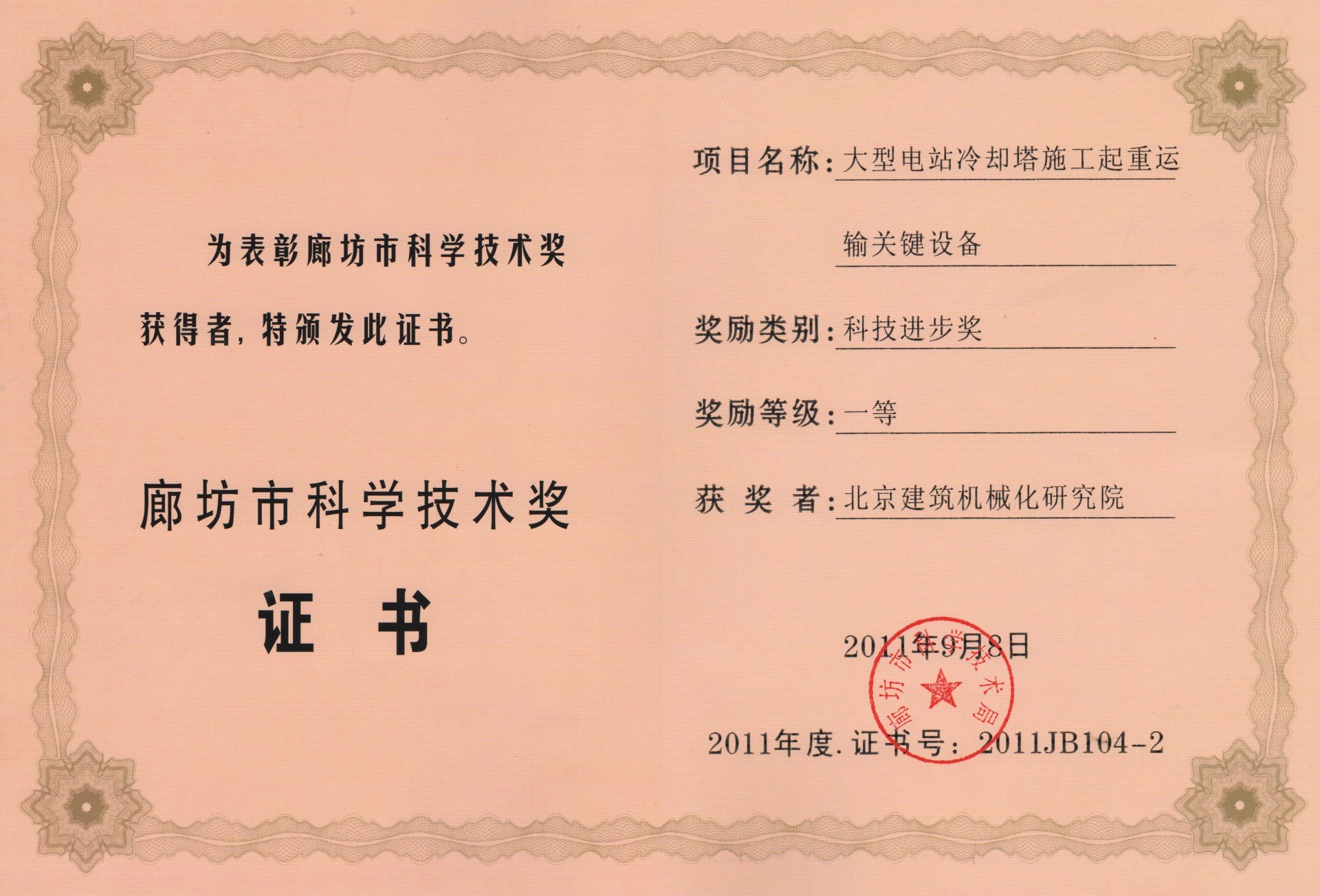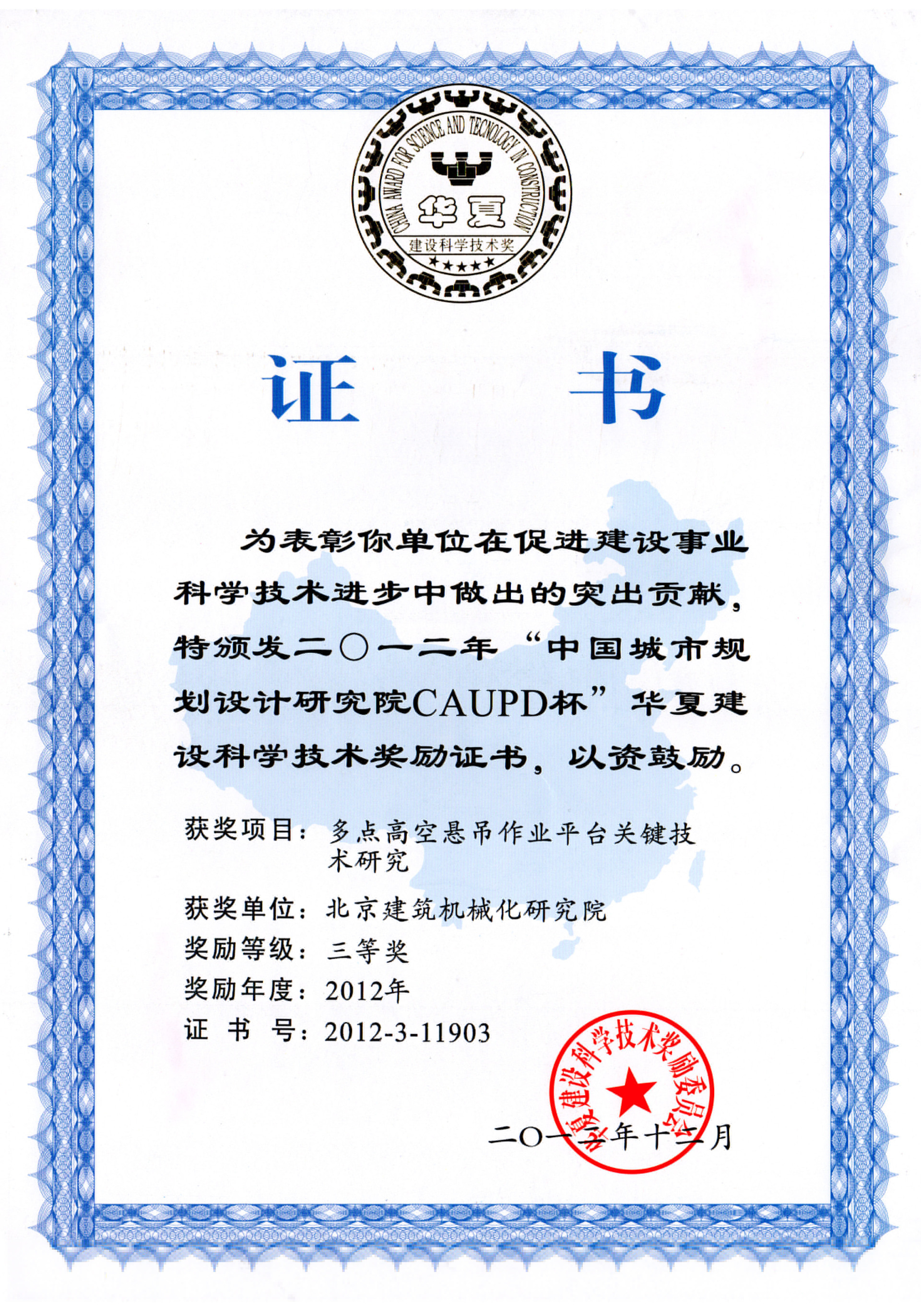 北京建筑機械化研究院—獲獎證書